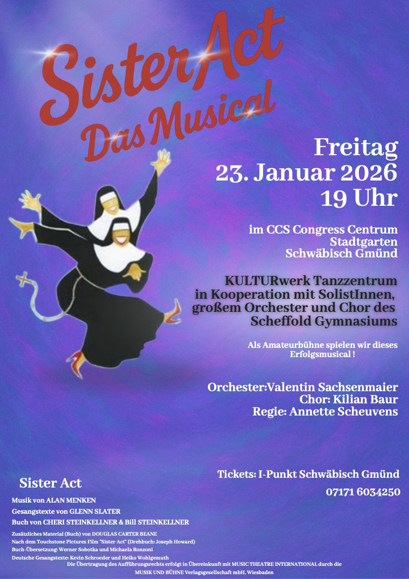 Im Januar 2026 heißt es Bühne frei! Solistinnen & Solisten, großes Orchester und Chor des Scheffold-Gymnasiums bringen gemeinsam mit dem Tanzzentrum KULTURwerk Schwäbisch Gmünd das faszinierende Musical “Sister Act” voller Energie, Humor und Gänsehautmomenten auf die Gmünder Stadtgartenbühne.