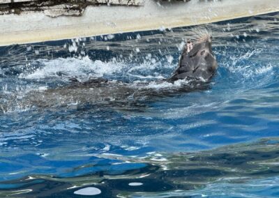 In der Wilhelma erwarteten uns spannende Führungen zu den Themen „Säugetiere“, „Anpassungen von Säugetieren“ sowie „Vögel“. Was wirklich toll ist, sind die großen geheimnisvollen Körbe, die die Wilhelma-Biologen zu den Führungen mitbringen. Darin verbergen sich Modelle von Tieren, Haare von Robben, Schnurrhaare von Geparden, Skelette von Fledermäusen und allerlei mehr. So bietet sich nicht nur die einzigartige Möglichkeit, die Tiere live zu beobachten, sondern bei manchen auch einen Eindruck über Fellstruktur und Flexibilität von Schnurrhaaren zu „erfühlen“.