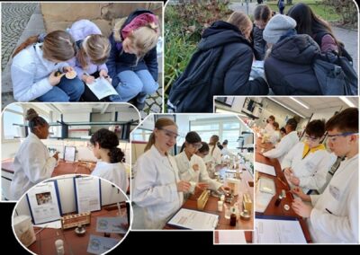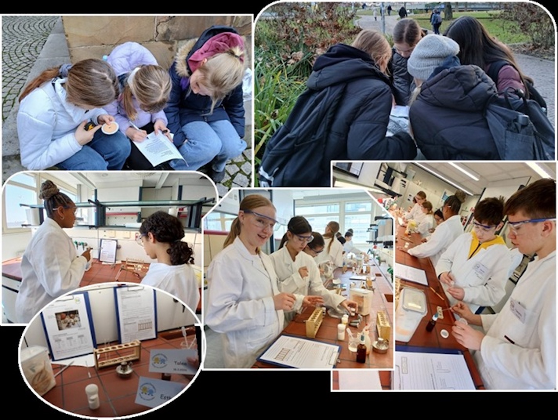 Einige Wochen später war es dann auch für die Mkids der Klassen 7 soweit: Wir fuhren ins Fehling-Lab der Universität Stuttgart. Hier galt es, einen fiktiven Kriminalfall zu lösen. Und so fanden wir uns schon wenige Minuten nach Ankunft in Laborkittel, mit Schutzbrille und Klemmbrett als Kriminaltechniker in einem professionellen Labor wieder. Nachdem die Tatortproben gesichert und dokumentiert waren, begannen wir mit ersten optischen Analysen. Zusätzlich erhitzten wir die Proben, sodass durch logische Folgerungen der Ergebnisse erste Verdachtsproben ausgeschlossen werden konnten. Demnach folgten mehrere chemische Untersuchungen, ehe feststand, dass Acetylsalicylsäure im Mehl der Brötchen eine allergische Reaktion beim Opfer ausgelöst hatte. Fall geklärt!